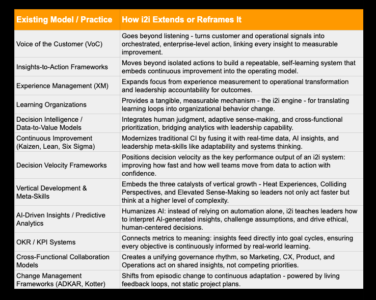There are many frameworks out there – Voice of the Customer, continuous improvement, decision intelligence, learning organizations. i2i connects and extends them.
